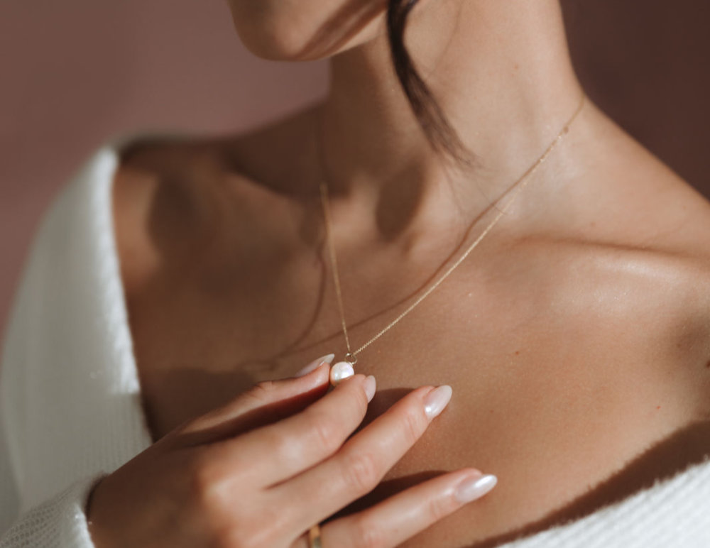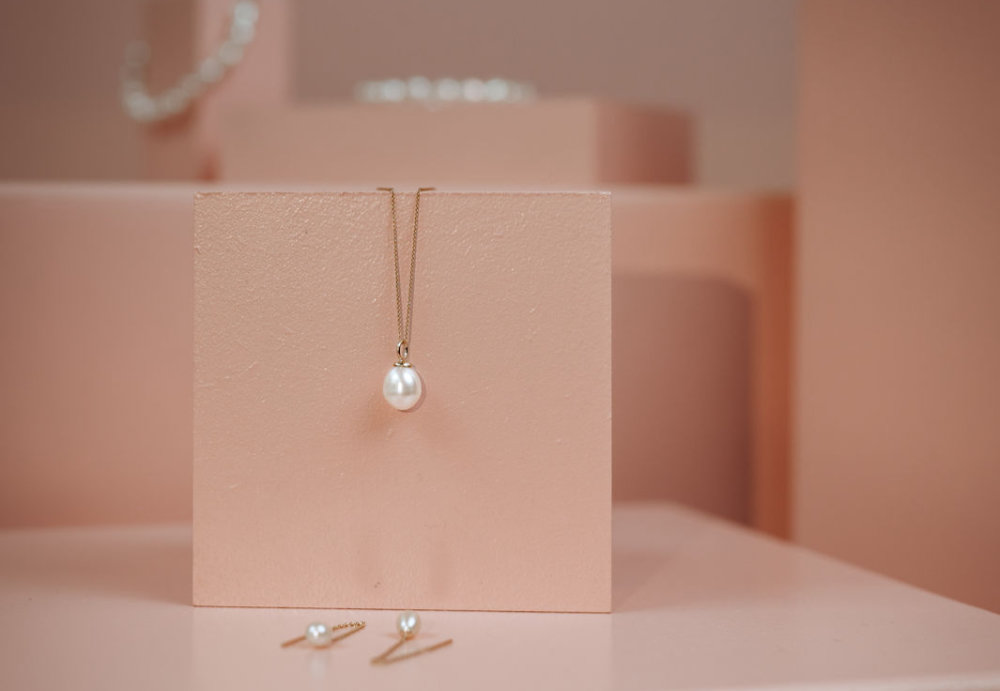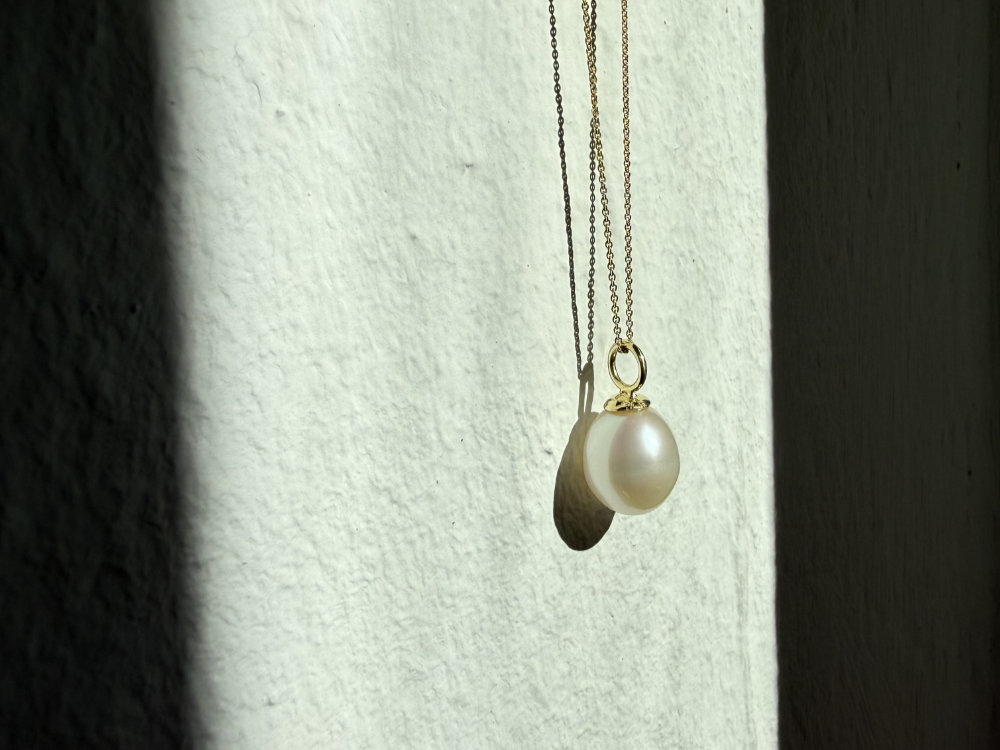 Eine Süßwasserperle, gehalten von einer feinen Echtgold-Aufhängung.